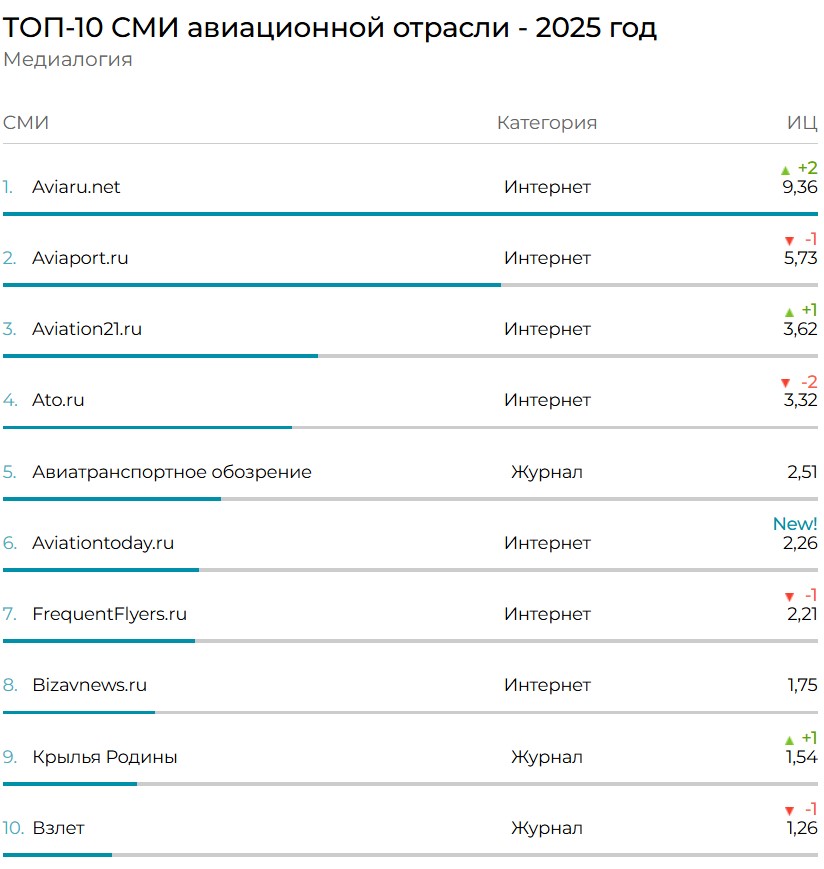 Компания «Медиалогия» подготовила рейтинг самых цитируемых медиаресурсов авиационной отрасли за 2025 год. По итогам прошлого года рейтинг ИА BizavNews, работающего исключительно в сегменте бизнес-авиации, сохранил свой рейтинг.