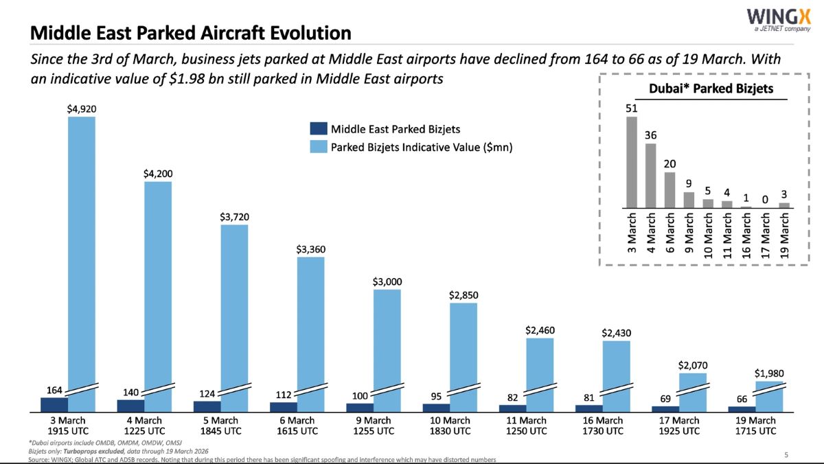 Управляющий директор WingX Ричард Кое представил данные, иллюстрирующие резкое снижение числа бизнес-джетов, припаркованных в аэропортах Ближнего Востока. Их общее количество сократилось со 164 самолётов 3 марта до 66 ВС 17 марта. Однако общая стоимость тех джетов, которые всё ещё находятся в зоне конфликта, составляет $1,98 млрд.