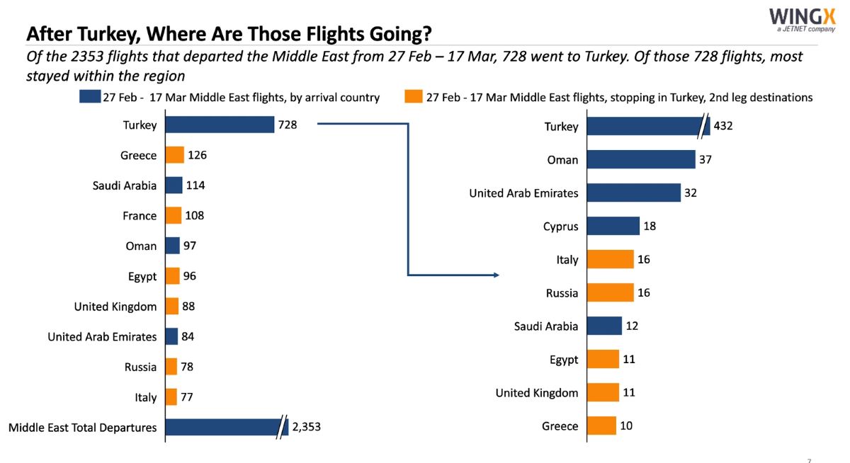 Анализ, проведённый компанией за последние три недели, показывает чёткую тенденцию миграции в такие города, как Стамбул и Анкара в Турции, а также в столицу Омана, Маскат. Многие самолёты впоследствии переместились в более отдаленные места, в том числе в Италию, Россию, Египет, Великобританию и Грецию.