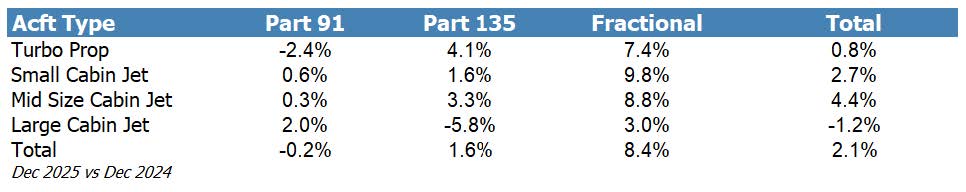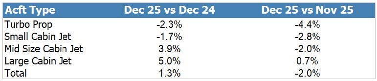По категориям самолётов наибольший рост в декабре показали средние бизнес-джеты – на 4,4%, за ними следуют лёгкие джеты и турбовинтовые самолёты с приростом на 2,7% и 0,8% соответственно. Однако активность в сегменте больших бизнес-джетов в декабре снизилась на 1,2%, а полёты самолётов с большим салоном по Part 135 – на 5,6%. Наибольший рост в отдельных сегментах наблюдался у лёгких джетов в долевом владении – на 9,8%.