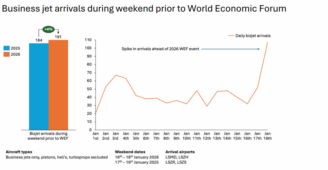 Всемирный экономический форум в Давосе всегда привлекал значительное количество бизнес-джетов, и мероприятие 2026 года, похоже, не стало исключением: в выходные перед началом форума в ближайшие аэропорты прибыл 191 бизнес-джет, что на 4% больше, чем в прошлом году.