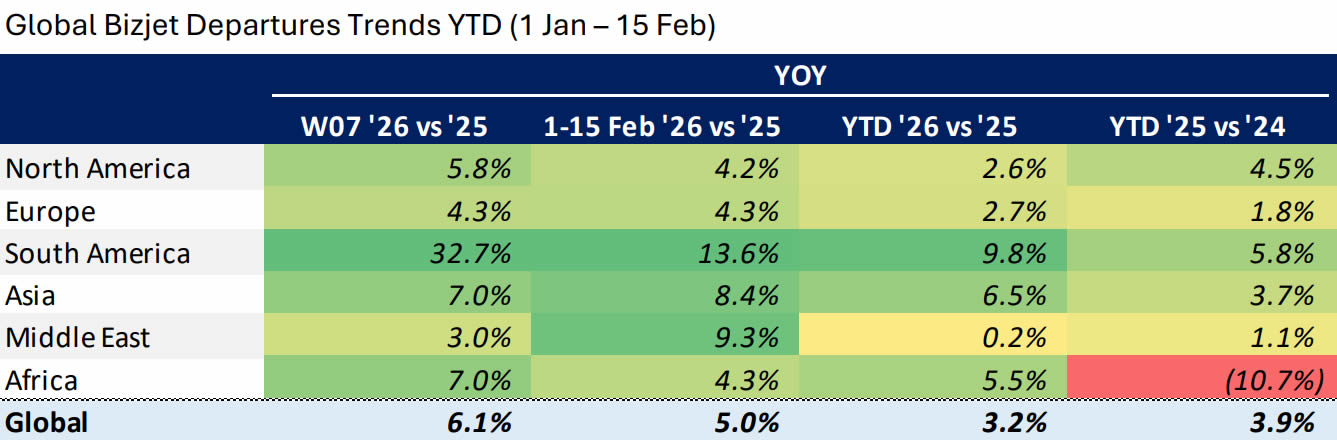 С начала года (с 1 января по 15 февраля) мировой трафик бизнес-джетов на 3,2% превышает аналогичный период прошлого года, но всё ещё немного отстает от темпов роста в 3,9%, достигнутых за тот же период 2025 года по сравнению с 2024 годом.