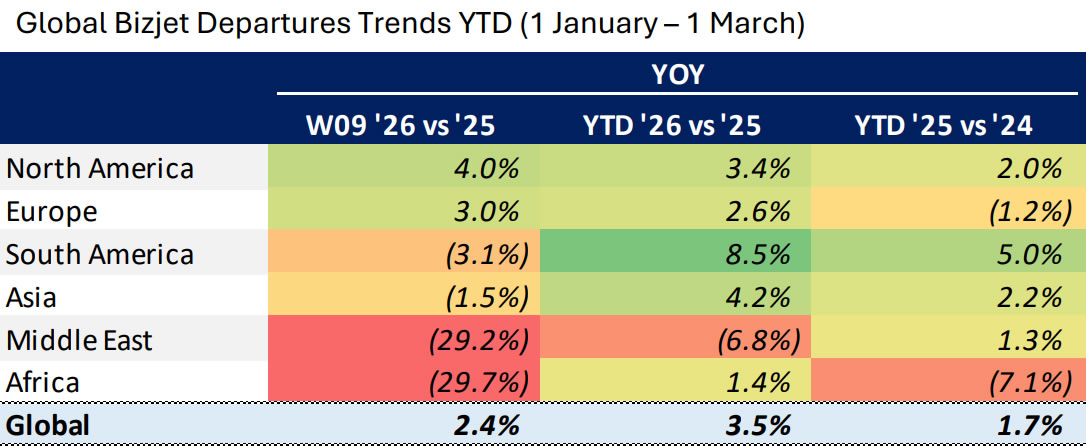 В глобальном масштабе трафик бизнес-джетов на 9-й неделе (23 февраля – 1 марта) вырос на 2,4% по сравнению с той же неделей прошлого года, а с начала года рост составляет внушительные 3,5%, что является ускорением по сравнению с ростом на 1,7%, достигнутым за тот же период 2025 года по сравнению с 2024 годом. Северная Америка продолжает лидировать по недельному росту на уровне 4,0%, и на 3,4% с начала года, в то время как Европа демонстрирует рост на 3,0% на 9-й неделе и на 2,6% с начала года. Южная Америка с начала года показала +8,5%, что подтверждает её статус ведущего развивающегося рынка, даже несмотря на более слабый рост на 9-й неделе.