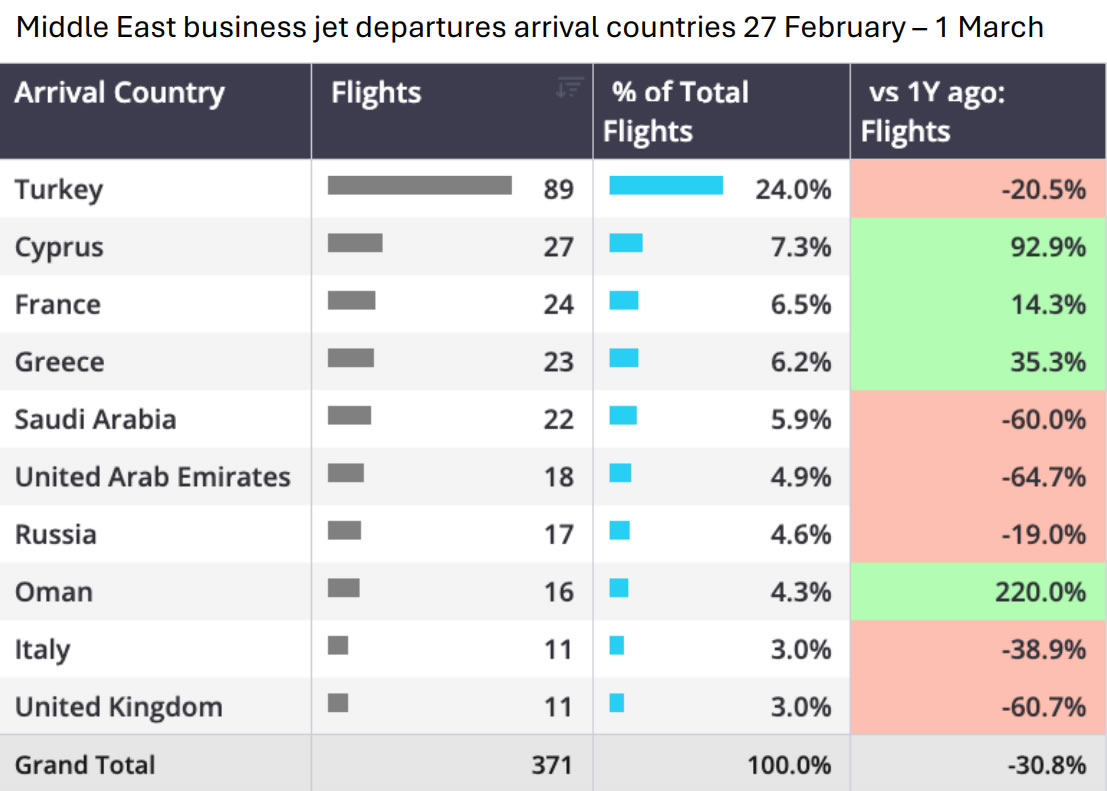 Несмотря на общее падение числа рейсов, в период с 27 февраля по 1 марта из аэропортов Ближнего Востока вылетел 371 бизнес-джет. Структура направлений наглядно демонстрирует: самолёты направлялись в основном в соседние и близлежащие региональные рынки, с заметным перекосом в сторону стран, предлагающих географическую близость и операционную стабильность. Наибольшее снижение наблюдалось в количестве рейсов внутри региона, например, в Саудовской Аравии и внутри неё рейсы сократились на 60%.