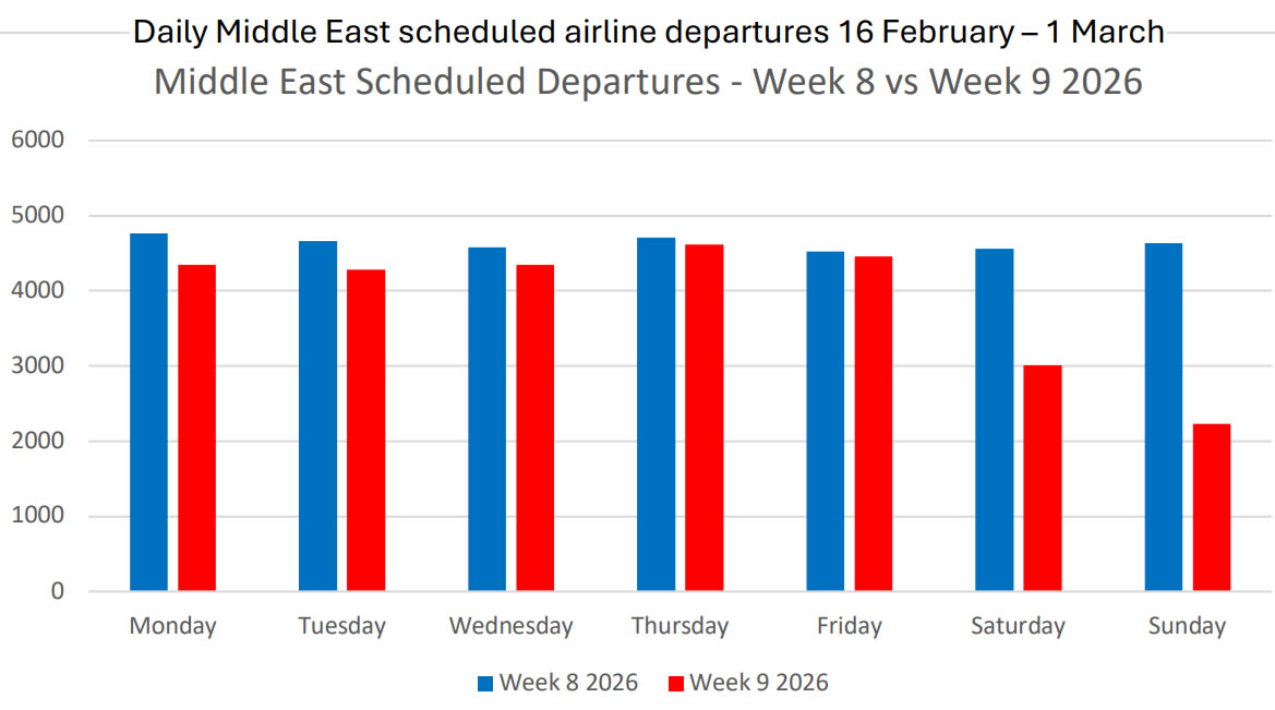 Коммерческие пассажирские перевозки на Ближнем Востоке в целом до пятницы, 27 февраля, оставались в пределах нормы, а затем резко ухудшились 28 февраля, когда вступили в силу ограничения на использование воздушного пространства, и авиаперевозчики начали приостанавливать полёты. На диаграмме сравнивается количество рейсов регулярных авиакомпаний по дням между 8-й неделей (16-22 февраля) и 9-й неделей (23 февраля - 1 марта), иллюстрируя момент, когда ситуация резко ухудшилась в субботу, 28 февраля.