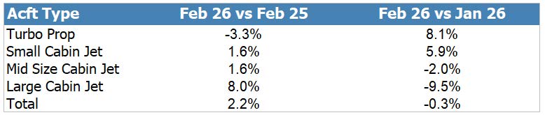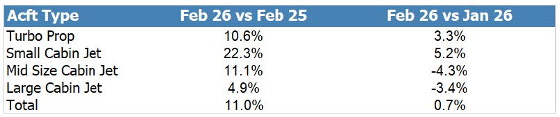 В начале года в этих регионах продолжается рост активности. Общий трафик в феврале вырос на 11,0% в годовом исчислении, при этом спрос увеличился по всем четырём категориям самолётов. Активность по сравнению с январём 2026 года выросла на 0,7%.