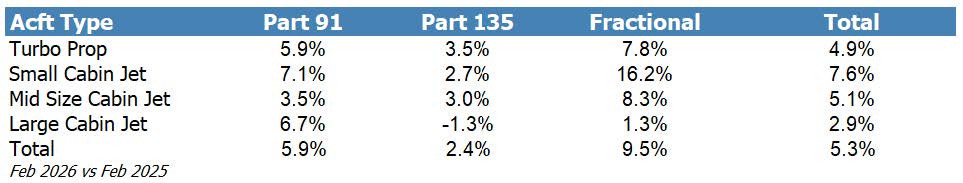 Данные TRAQPak показывают, что в феврале 2026 года в Северной Америке наблюдался рост активности бизнес-авиации на 5,3% по сравнению с прошлым годом. В этом месяце было зафиксировано примерно на 500 рейсов в день больше, чем в феврале 2025 года, и примерно на 1000 рейсов в день больше, чем в январе 2026 года. Результаты по всем операционным категориям были положительными, при этом наибольший рост трафика показали самолёты в долевом владении, на 9,5% в годовом исчислении. Полёты по правилам Part 91 и Part 135 также показала хорошие результаты, увеличившись на 5,9% и 2,4% соответственно.