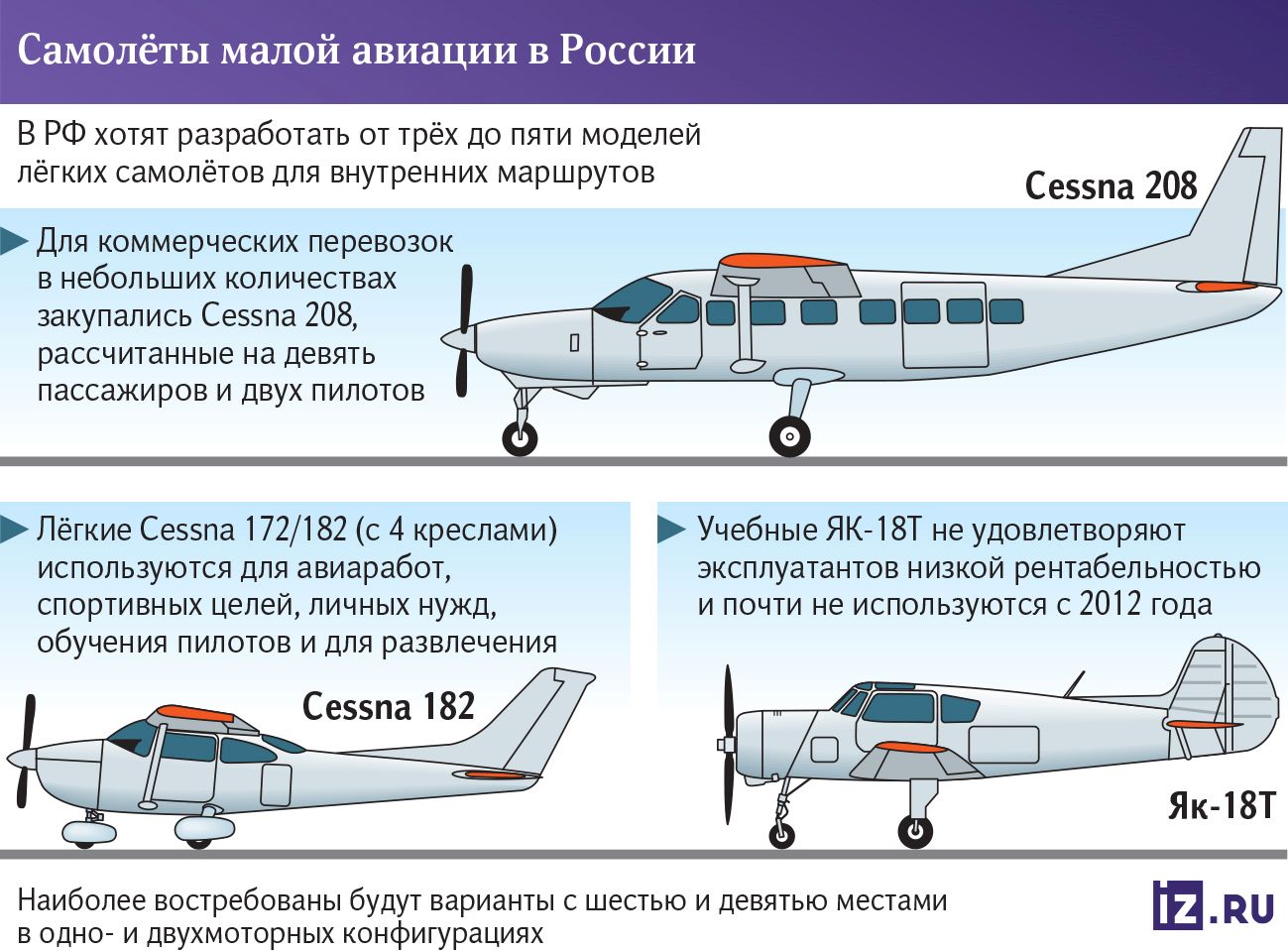 Это, в частности, лёгкие Cessna 172/182 (с четырьмя креслами), которые в России использовались для авиаработ, спортивных целей, личных нужд, обучения пилотов и для развлечения. Для коммерческих перевозок в небольших количествах закупались Cessna 208 (шесть кресел) и Cessna 208, рассчитанные на девять пассажиров и двух пилотов. Это базовая модель, на основе которой строились пассажирские и грузовые модификации, а также амфибии.