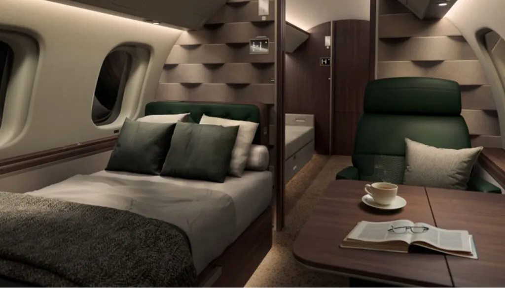 Концепция, основанная на модели Global 7500, включает в себя главный салон с роскошными креслами насыщенных тонов, кабинет, сочетающий функциональные поверхности с успокаивающей палитрой для снижения стресса, отдельную спальню с мягкими тонами и текстурами, а также ванную комнату с перламутровой и латунной матовой сантехникой Siminetti.