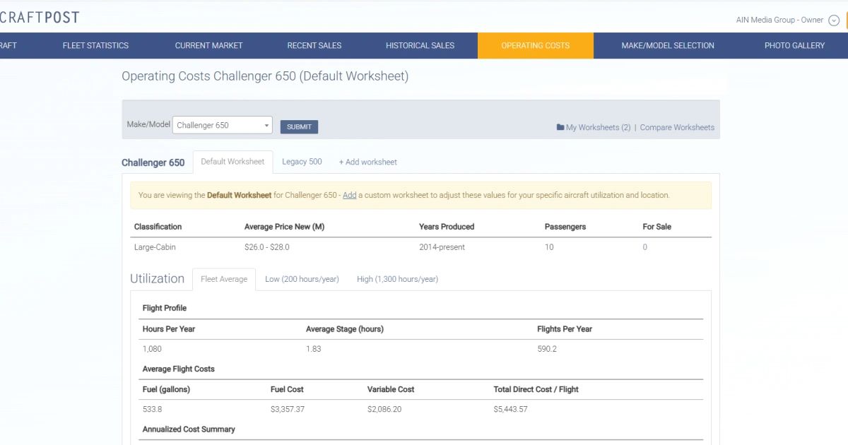 Компания AircraftPost, занимающаяся оценкой и анализом данных о деловых самолётах, запустила инструмент для сравнения годовых и почасовых эксплуатационных расходов 125 типов бизнес-джетов в режиме реального времени, что позволяет принимать обоснованные решения о покупке, эксплуатации и управлении самолётами. AircraftPost принадлежит AIN Media Group.