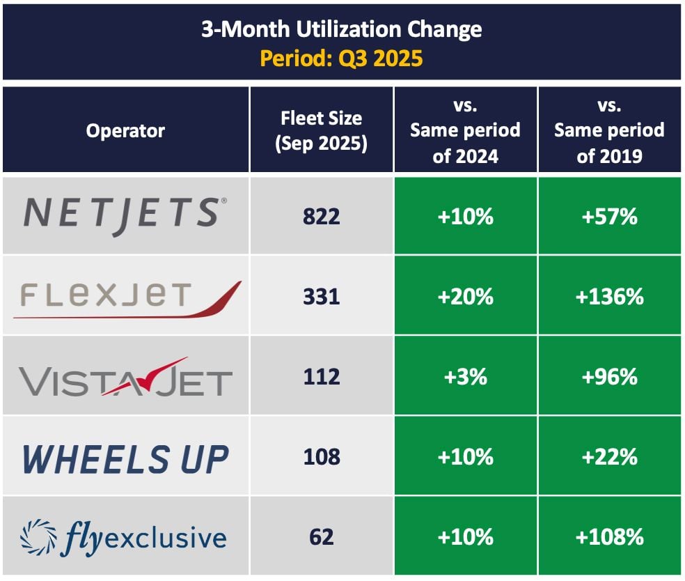 Сводные данные по налёту ведущих мировых перевозчиков деловой авиации, взятые из отчета Tracked Aircraft Utilization от Aviation Week Network, показывают, что у NetJets, Flexjet, VistaJet, Wheels Up и Fyexclusive в третьем квартале 2025 года показатель использования воздушных судов превысил уровень за аналогичный период 2024 года. Общие показатели по всем пяти операторам также превысили показатели третьего квартала 2019 года.