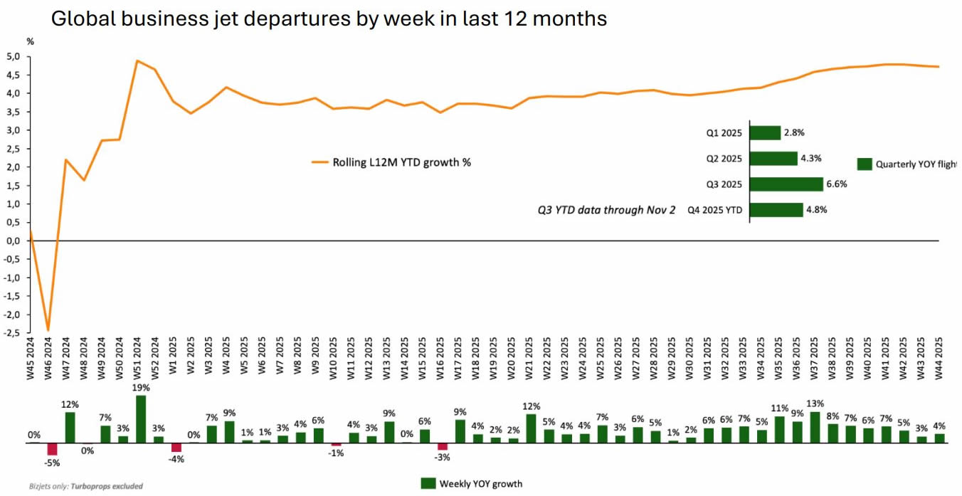 Согласно еженедельному обзору WINGX Business Aviation Bulletin, на 44-й неделе (27 октября - 2 ноября) глобальная активность бизнес-джетов достигла 73356 рейсов, что на 4% больше, чем на 44-й неделе 2024 года. За последние четыре недели (41-44 недели) общий трафик бизнес-джетов во всём мире превысил 312000 рейсов, что на 5% больше, чем за аналогичный период прошлого года. Эта четырёхнедельная тенденция в +5% соответствует общемировому тренду с начала года +5%. Тем не менее, в последние несколько недель наблюдается небольшое снижение темпов роста.