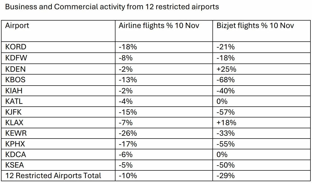 В понедельник, 10 ноября, FAA ввело ограничения на полёты частных самолётов в двенадцати аэропортах, обслуживающих преимущественно коммерческие авиакомпании. Первоначально ограничения были введены в начале этого месяца в ответ на приостановку работы правительства США с 1 октября, что привело к нехватке персонала в сфере управления воздушным движением во всей авиационной системе.