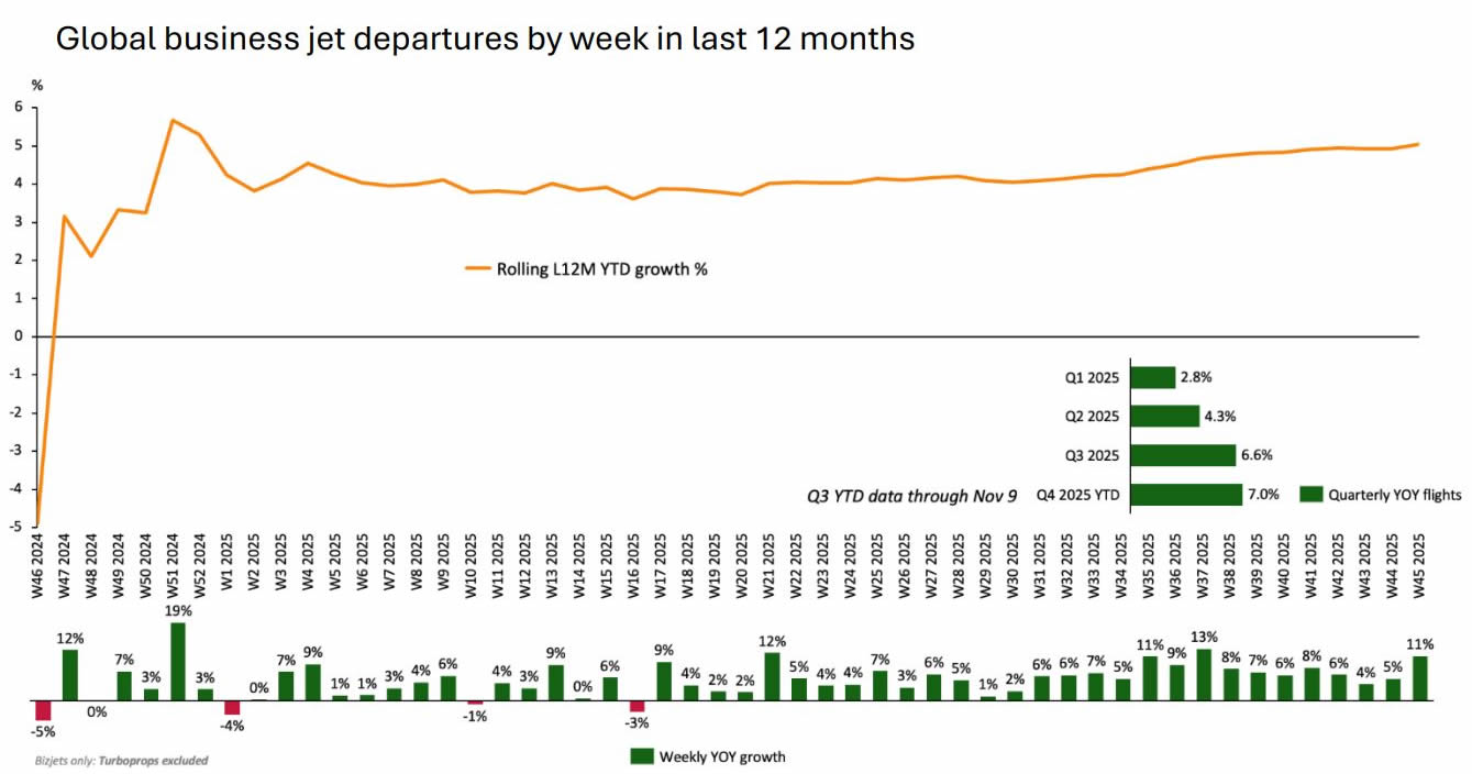 Согласно еженедельному обзору WINGX Business Aviation Bulletin, на 45-й неделе (3-9 ноября) 2025 года глобальная активность бизнес-джетов достигла 80000 вылетов, что на 11% больше, чем на 45-й неделе 2024 года. За последние четыре недели (42-45 недели) число рейсов бизнес-джетов во всём мире превысило 315000, что на 7% больше, чем в аналогичном периоде прошлого года. Эта четырёхнедельная тенденция в +7% превышает общемировой тренд с начала года в +5% (с 1 января по 9 ноября). Тем не менее, за последние несколько недель наблюдается небольшое снижение темпов роста.