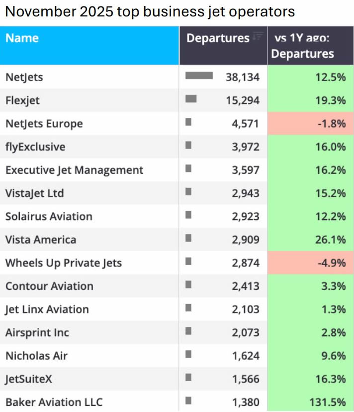 Согласно еженедельному обзору WINGX Business Aviation Bulletin, на 48-й неделе (24-30 ноября) 2025 года мировой трафик бизнес-джетов достиг 70779 рейсов, что на 3% больше, чем на той же неделе 2024 года. За последние четыре недели (45-48) во всём мире выполнено почти 310000 рейсов бизнес-джетов, что на 7% больше, чем за аналогичный период прошлого года. Эта четырёхнедельная тенденция в +7% превышает общемировой тренд с начала года в +5% (с 1 января по 30 ноября).