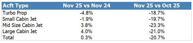 Как и ожидалось, в ноябре активность снизилась по сравнению с октябрем на 5,7%. Результаты по всем операционным категориям оказались отрицательными, при этом активность по Part 91 показала наибольшее снижение – на 9,2% по сравнению с октябрем. Долевой трафик снизился на 4,8%, а Part 135 – на 1,9%.