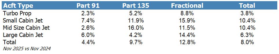 Согласно обзору TRAQPak, в ноябре 2025 г. трафик вырос на 8,0% по сравнению с предыдущим годом, что стало самым большим ростом с января 2015 г. без учета пандемии COVID-19. Предыдущий рекорд был зафиксирован в сентябре 2025 г. Все результаты по операционным сегментам в ноябре были положительными, при этом долевые перевозки выросли на 12,8% по сравнению с аналогичным периодом прошлого года. Активность по Part 135 начала пиковый праздничный сезон с ростом на 9,7%, а Part 91 – на 4,4% в годовом исчислении. Все категории воздушных судов также показали в ноябре значительный рост. Лидерами стали средние и лёгкие джеты с увеличением активности на 10,4%. Далее следуют крупногабаритные бизнес-джеты с ростом на 6,3%, а трафик турбовинтовых самолётов вырос на 3,8%. Во всех двенадцати отдельных сегментах в ноябре показан положительный результат. Наибольший рост был зафиксирован в сегменте средних джетов Part 135 с ростом на 16,0%. Следующими стали лёгкие самолёты в долевом владении, трафик которых вырос на 15,9%.