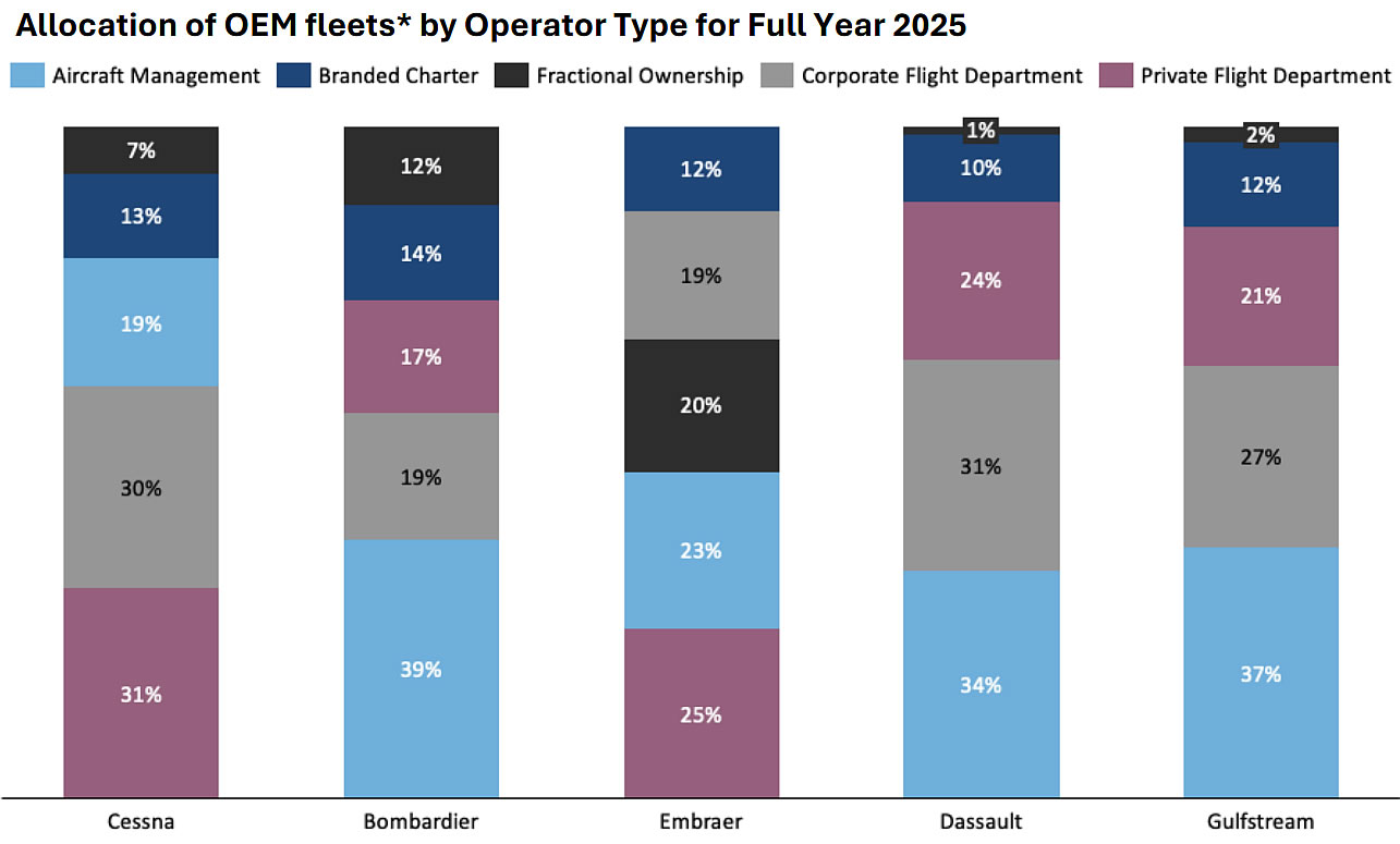 Анализ WINGX показывает значительные различия в распределении бизнес-джетов от разных производителей в зависимости от типа оператора:
