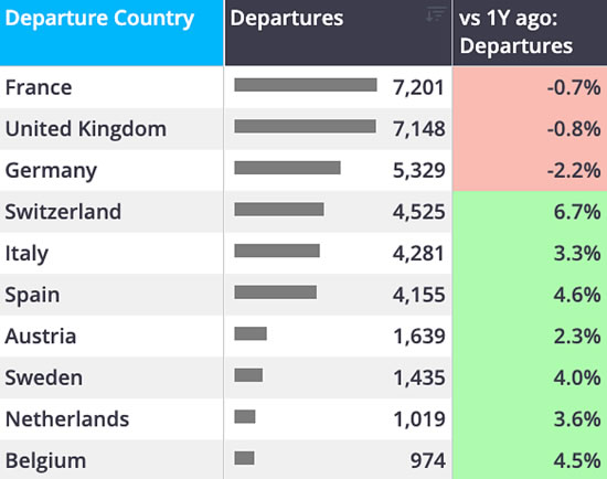 Трафик в Европе на второй неделе остался на том же уровне по сравнению с аналогичной неделей прошлого года, хотя и с существенными региональными различиями. Количество рейсов бизнес-джетов в Италии увеличилось на 7% по сравнению со второй неделей прошлого года, в Швейцарии выросло на 6%, напротив, трафик во Франции снизился на 5%, в Великобритании – на 6%, а в Германии – на 11% в годовом исчислении. Четырёхнедельный тренд в Европе (с 51-й недели 2025 года по 2-ю неделю 2026 года) вырос на 2% по сравнению с прошлым годом, при этом Италия лидирует по этому показателю с ростом на 6%, в то время как Великобритания и Германия показали снижение, на 3% и 1% соответственно.