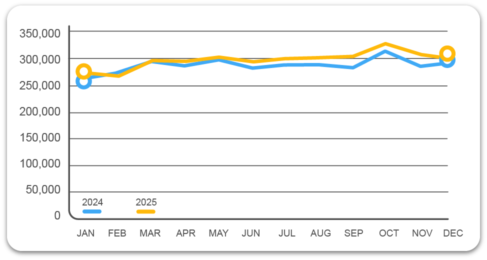 В 2025 году в Северной Америке наблюдался рост активности в годовом исчислении в 11 из 12 месяцев. Единственным месяцем, который показал снижение показателей, стал февраль, который был на один день короче февраля високосного года (2024). Самый успешный месяц в регионе за последние два года пришелся на октябрь 2025 года.