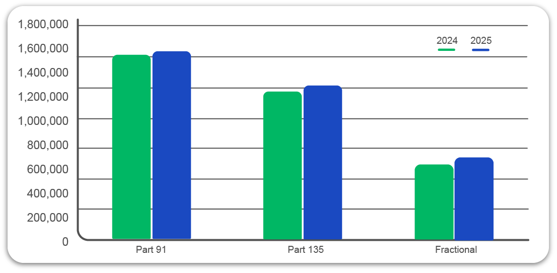 Активность деловой авиации в Северной Америке в 2025 году выросла на 3,4%, а количество лётных часов – на 3,5%. Все три категории операций показали рост, при этом лидируют долевые самолёты с годовым приростом на 9,4%, на 59826 рейсов. В категории Part 135 рост составил 3,3%, или на 41471 рейс, а в категории Part 91 – 0,9%, или 13520 дополнительных рейсов.