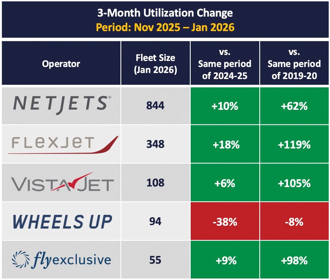 Согласно данным Aviation Week по использованию самолётов ведущих операторов деловой авиации показывают, что NetJets, Flexjet, VistaJet и Flyexclusive за период с ноября 2025 по январь 2026 года имели налёт выше, чем в аналогичном периоде 2024-2025 годов. В то же время, показатели Wheels Up за тот же трёхмесячный период снизились на 38% по сравнению с аналогичным периодом прошлого года.
