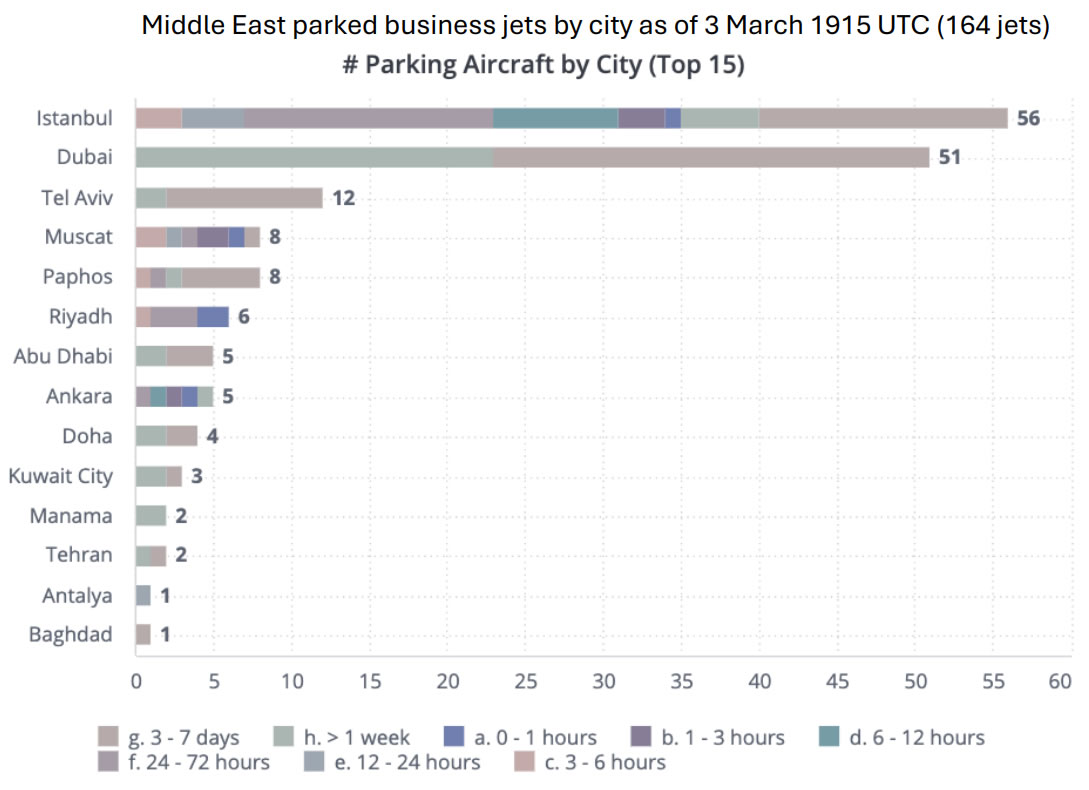 Припаркованные бизнес-джеты по городам Ближнего Востока (164 самолёта) по состоянию на 3 марта 19:15 UTC