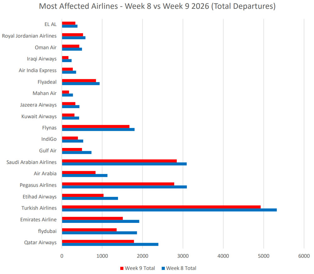 Коммерческие пассажирские перевозки на Ближнем Востоке в целом до пятницы, 27 февраля, оставались в пределах нормы, а затем резко ухудшились 28 февраля, когда вступили в силу ограничения на использование воздушного пространства, и авиаперевозчики начали приостанавливать полёты. На диаграмме сравнивается количество рейсов регулярных авиакомпаний по дням между 8-й неделей (16-22 февраля) и 9-й неделей (23 февраля - 1 марта), иллюстрируя момент, когда ситуация резко ухудшилась в субботу, 28 февраля.