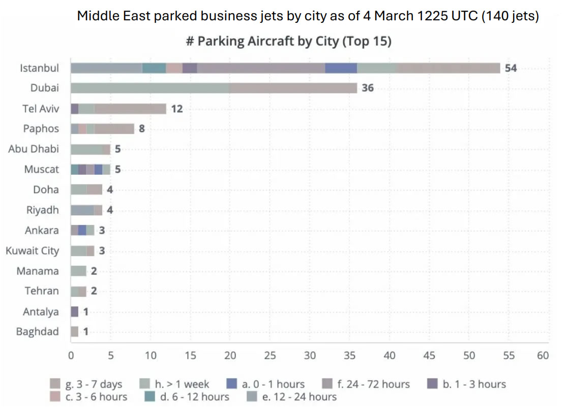 Данные WINGX о нахождении самолётов на стоянках показывают, что по состоянию на 3 марта 19:15 UTC в аэропортах Ближнего Востока простаивало 164 бизнес-джета со средней продолжительностью стоянки 4,5 дня, что указывает на то, что большая часть этих простоев приходится на постконфликтный период, начавшийся 28 февраля. К 4 марта 12:25 UTC общее число сократилось до 140 самолётов, хотя средняя продолжительность стоянки увеличилась до 4,9 дня, что говорит о том, что, хотя некоторые самолёты начали перемещаться, оставшиеся всё больше задерживаются на своих стоянках.