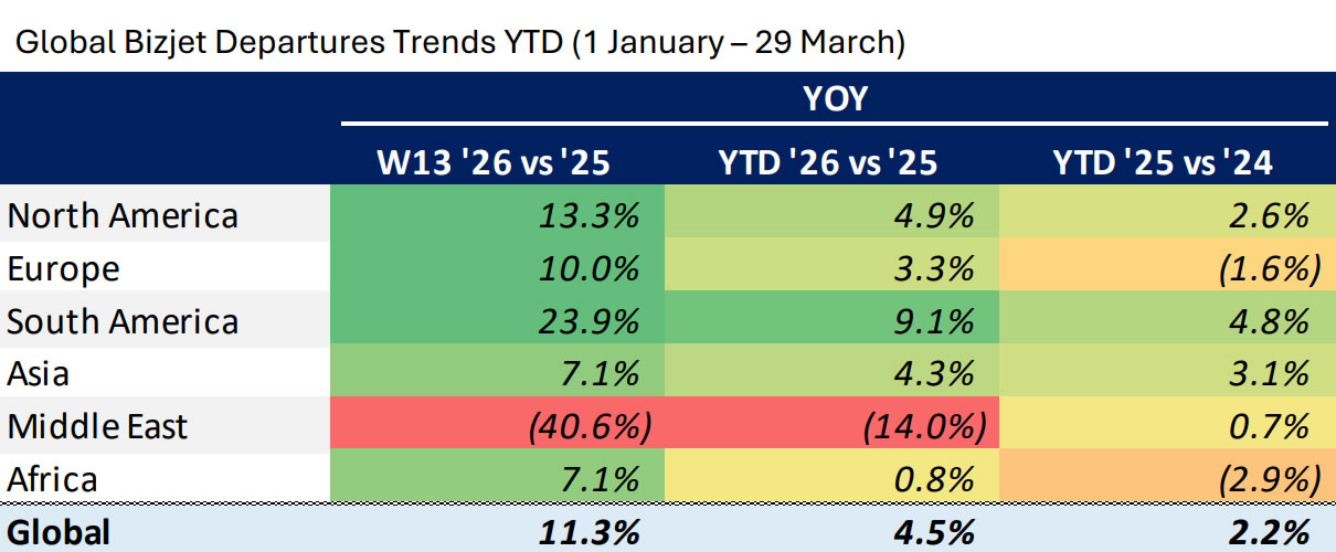 Оказавшись между стремительно растущими расходами и рушащейся надёжностью обслуживания, всё бо́льшее число путешественников обращается к деловой авиации, и данные начинают это подтверждать. На 13-й неделе глобальная активность бизнес-джетов выросла на 11,3% в годовом исчислении, несмотря на то что на Ближнем Востоке продолжается одно из самых резких падений трафика с начала конфликта.