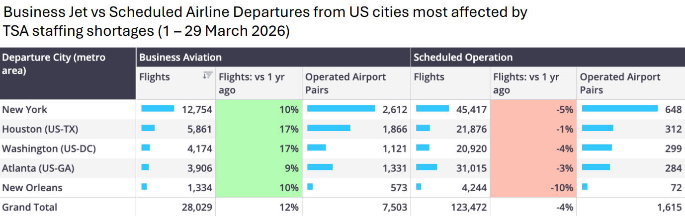 Сравнение трафика бизнес-джетов и регулярных авиакомпаний из городов США, наиболее пострадавших от нехватки персонала в Управлении транспортной безопасности (TSA) (с 1 по 29 марта 2026 г.)