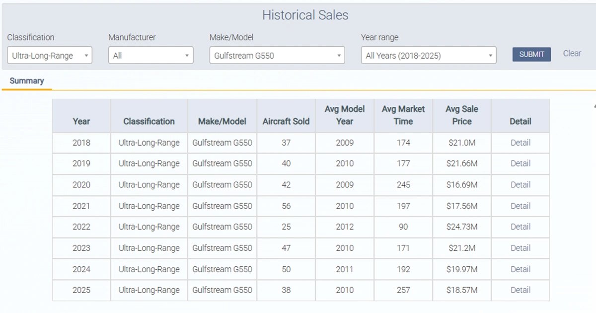Сервис AircraftPost, входящий в группу AIN Media Group и предоставляющий данные по оценке и сделкам с подержанными бизнес-джетами, в качестве нового дополнения начал предлагать подписчикам доступ к историческим данным. Текущие подписки позволяют пользователям просматривать данные о сделках с бизнес-джетами за последние 6-12 месяцев, а опция исторических данных расширяет этот диапазон до 2018 года.