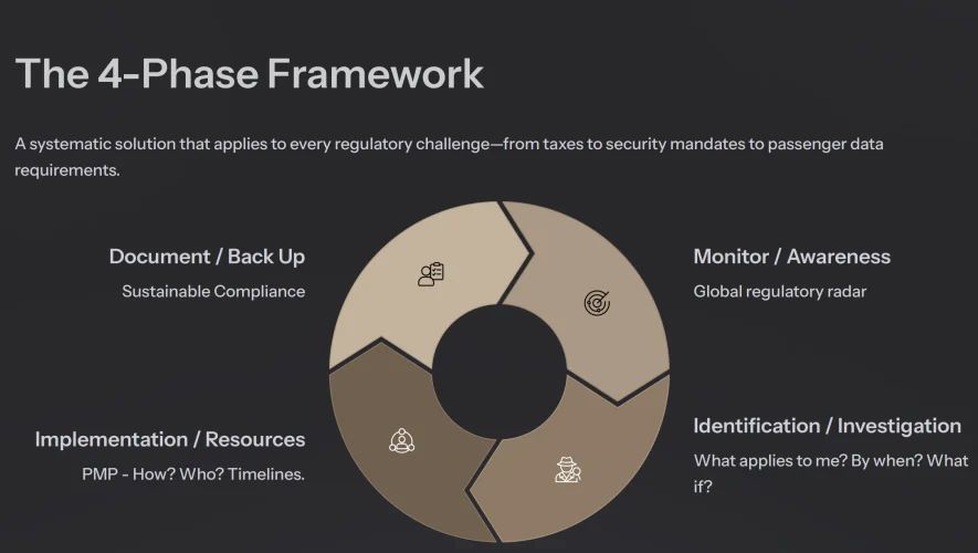Идентификация и исследование: Этот этап включает в себя расстановку приоритетов требований, определение применимости для чартерных и частных перевозок, а также определение того, кто несёт ответственность за соблюдение требований: оператор, пассажир или оба вместе. «Понимание того, кто несёт бремя, каков потенциальный результат – будет ли задействовано юридическое лицо?» Хартли заявил, что такие программы, как EU-LISA, требуют наличия корпоративной документации, включая свидетельства о регистрации и устав.