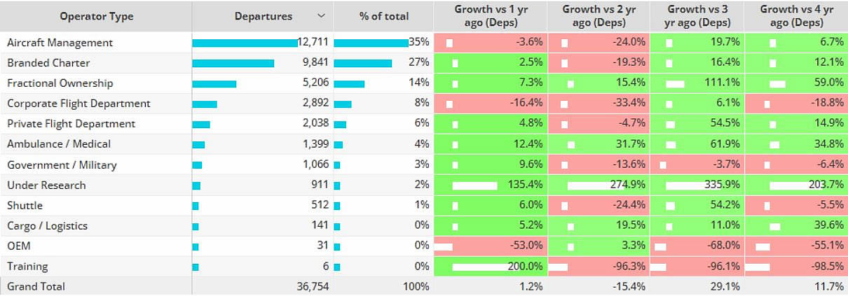 Типы операторов бизнес-джетов в Европе в 2023 г. по сравнению с предыдущими годами