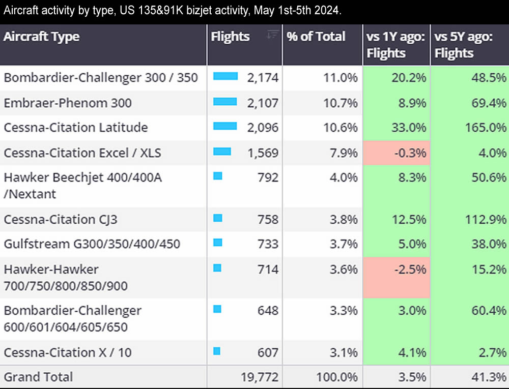 Активность бизнес-джетов по типам в США, Part 135 и 91K, 1-5 мая 2024 г.