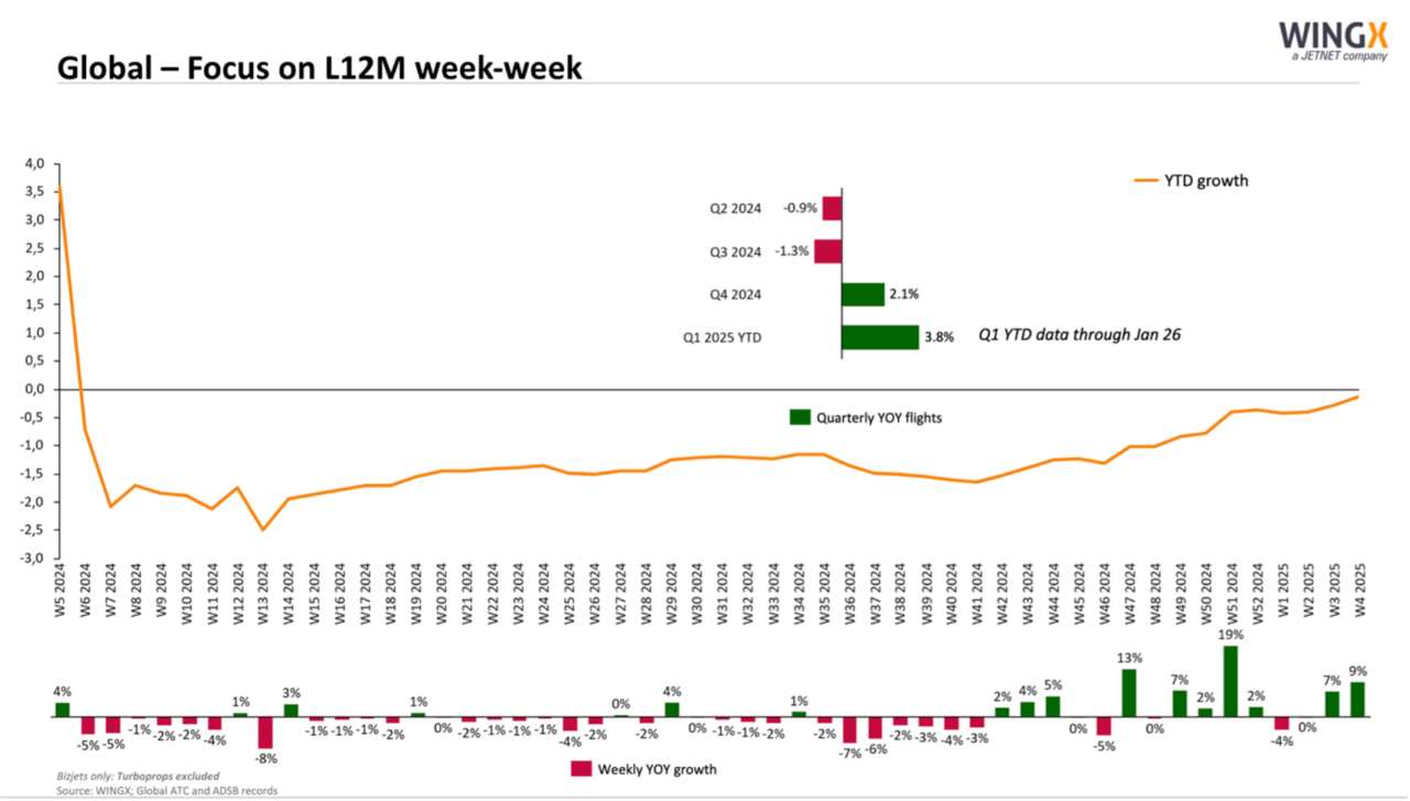 Согласно еженедельному обзору WINGX Business Aviation Bulletin, с начала года (1-26 января) объем полетов бизнес-джетов во всем мире на 4% превысил показатель прошлого года и составил 239334 рейса. Общемировой активный флот вырос на 1% по сравнению с прошлым годом, более 19000 бизнес-джетов выполняли полеты в этом году. На 4-й неделе (20-26 января) активность бизнес-джетов была на 9% выше по сравнению с прошлым годом, в основном из-за роста тенденции в США, связанной с церемонией инаугурации Трампа.