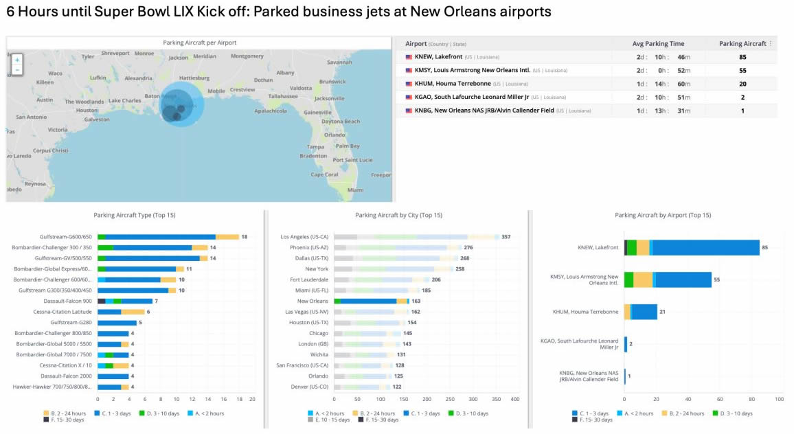 Когда NFL (Национальная футбольная лига) приземлилась в Caesars Superdome в Новом Орлеане для Суперкубка LIX, бизнес-джеты последовали за ней. Аэропорты в районе Нового Орлеана (KMSY, KNEW, KHUM, KGAO, KNBG) зафиксировали в течение недели Суперкубка значительный рост трафика. В период с пятницы по воскресенье в аэропорты Нового Орлеана прибыло 611 бизнес-джетов, что больше, чем 109 рейсов в течение предыдущего периода с пятницы по воскресенье в тех же аэропортах.