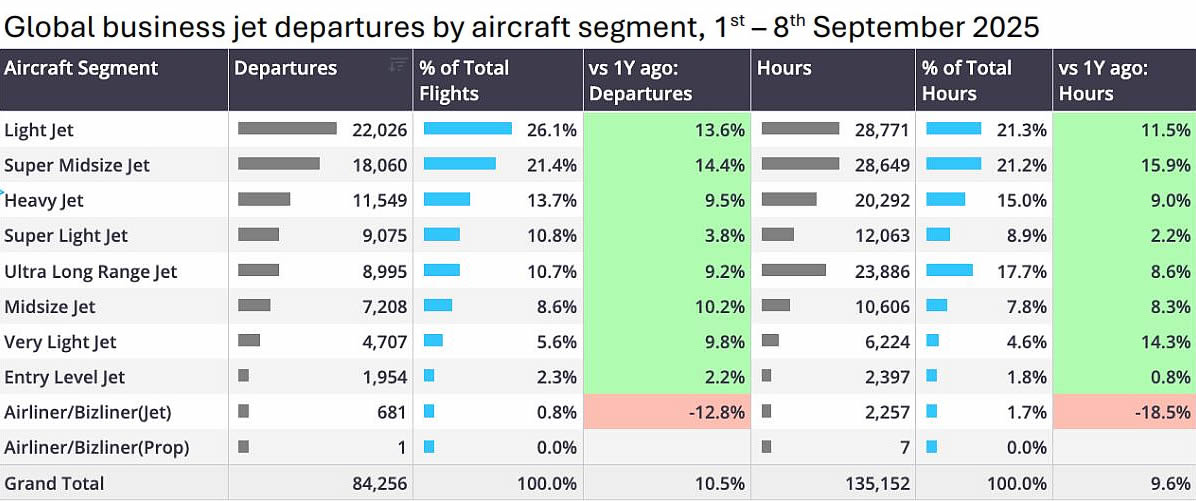 C начала сентября (1-8 число) наблюдался устойчивый рост активности в бизнес-джетов: общий трафик в мире увеличился на 11% по сравнению с аналогичным периодом прошлого года, а налёт вырос на 10%. Лидерами рынка стали лёгкие и суперсредние самолёты, на долю которых пришлось почти половина всех рейсов и которые показали двузначный рост. Кроме того, значительный рост продемонстрировали сверхдальние и тяжёлые джеты. Единственное значительное снижение наблюдалось в сегменте бизнес-лайнеров.