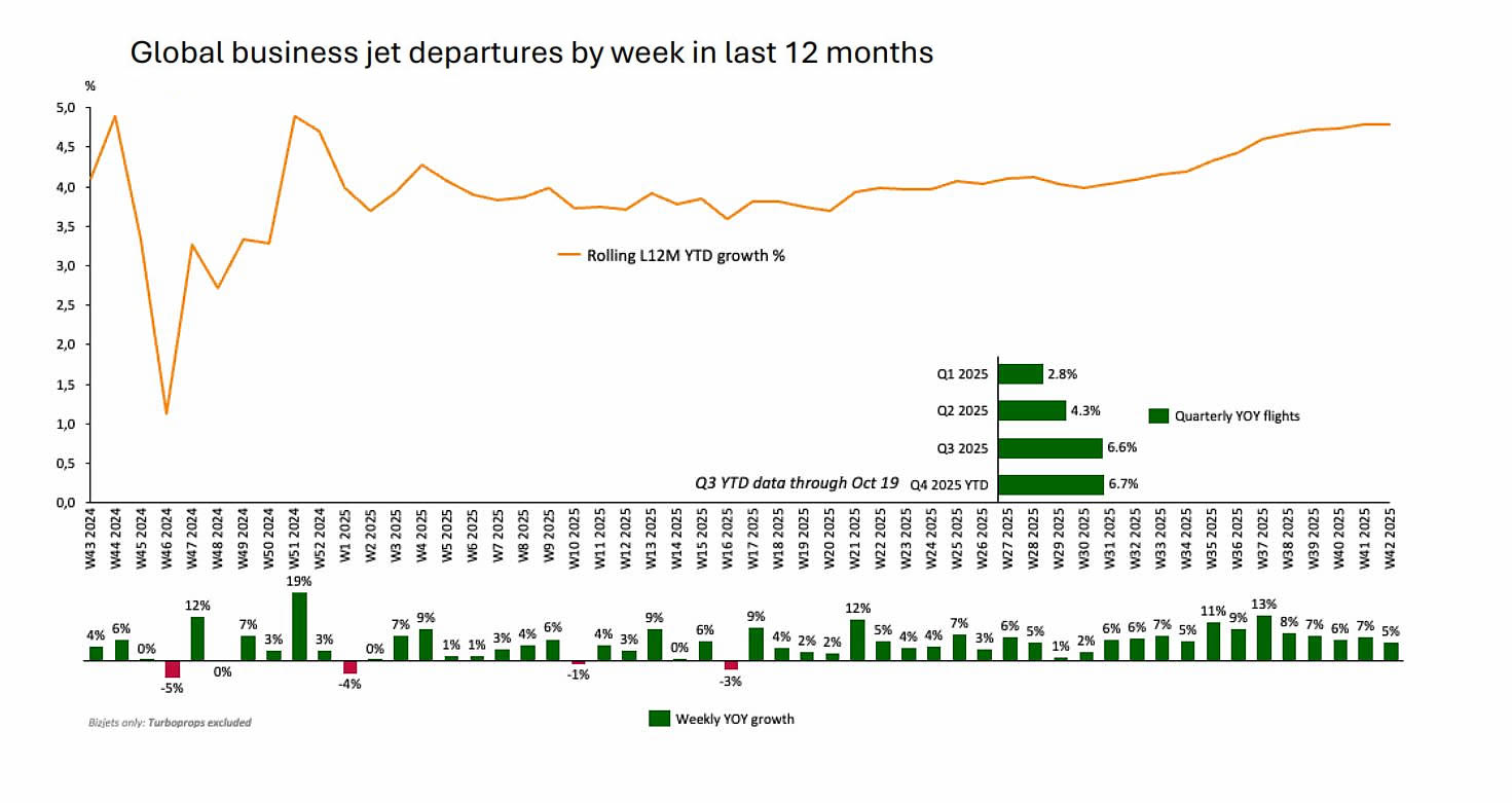 За последние четыре недели (39-42) общий трафик бизнес-джетов во всём мире превысил 316000 полётов, что на 6% больше, чем в аналогичном периоде прошлого года. Эта четырёхнедельная тенденция +6% превышает общемировой годовой тренд с начала года +5% (с 1 января по 19 октября). И этот тренд не показывает признаков завершения: 26 недель подряд наблюдается рост в годовом исчислении. Из 42 недель 2025 года в 39-ти зафиксирован рост, при этом наибольший скачок на 13% пришелся на 37-ю неделю, а наибольшее падение на 4% — на 1-ю неделю.
