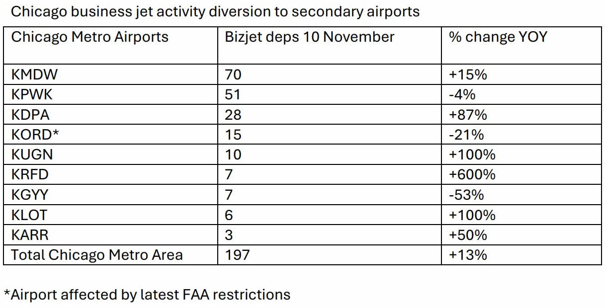 Фактически, 10 ноября в городских районах, которые обслуживают эти 12 аэропортов, активность бизнес-джетов выросла на 10%. Более того, неудобства, связанные с нестабильным расписанием рейсов, почти наверняка привели к росту спроса на более дорогие, но и более надёжные бизнес-джеты в небольших аэропортах, не затронутых кризисом.